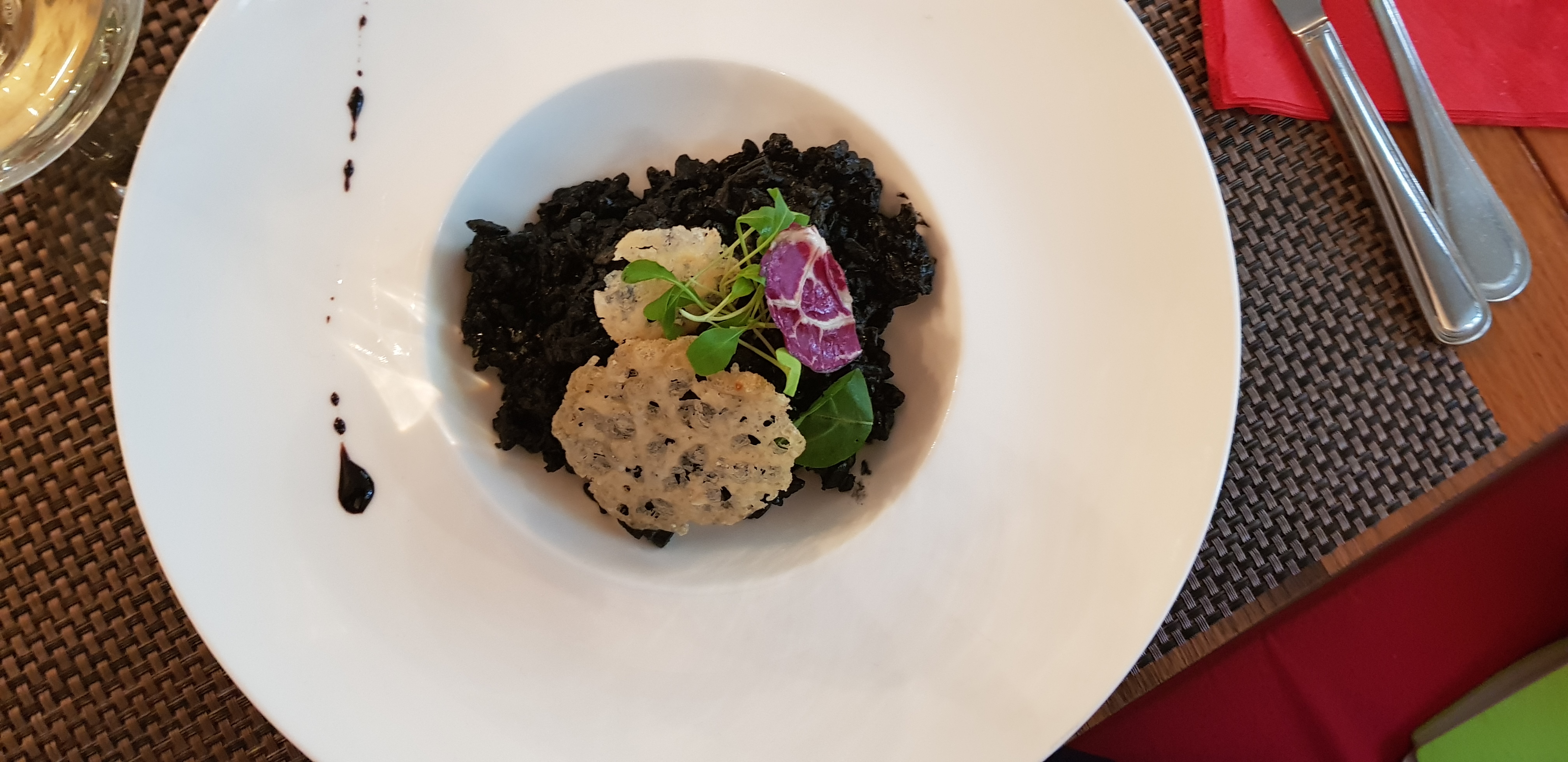 Po odlični predjedi smo se odločili poskusiti mesni in ribji meni. Oba sta izgledala fantastično. V ponudbi je bila črna sipina rižota in ramsteak tagliata. Moram priznati, da je bil menu resnično načrtovan na najvišji kulinarični ravni, poleg norih okusov, pa je bil krožnik še lep na pogled. Okraski so bili skrbno oblikovani, na krožnik so bili dodani koščki različnih dodatkov, ki so še povečali božanskost okušanja glavne jedi. Posebej zanimiva je bila rižota, saj je bila preprosta in brez prekomernega dodajanja začimb, a kljub temu naravnost fantastična. V tem primeru bi vsekakor lahko uporabili rek: “Manj je več!”.